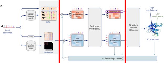 Figure 1. Flow diagram of the functioning of AlphaFold 2. AlphaFold 3 uses Pairformer (and a Diffusion module) rather than Evoformer as a transformer. Adapted from [5].