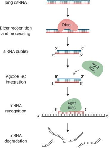 Developed in the early 2000s, RNA interference (RNAi) silences genes by blocking their translation from DNA into protein [4-6]. The process is initiated by the ribonuclease III enzyme Dicer, which cleaves sequence-specific target mRNAs into short double-stranded RNA segments (see Figure 1) [4, 7]. These segments are known as small interfering RNAs (siRNAs), and they assemble with the RNA-induced silencing complex (RISC) in the cytoplasm. This complex specifically recognizes target mRNA sequences homologous to the siRNA. Nucleases (here, the Ago2 protein) bind to and degrade the mRNA, preventing protein translation and subsequent expression of the target gene [4, 8].